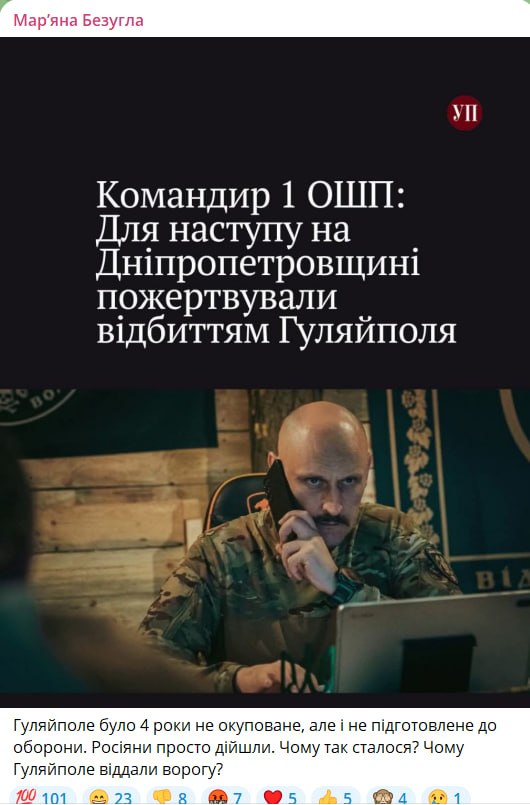 Небезызвестная украинская депутатка Марьяна Безуглая, против которой недавно было возбуждено уголовное дело о госизмене, возмутилась тем, что командование ВСУ сначала пожертвовало Гуляйполем ради наступления в Днепропетровской области, а затем провалило это самое наступление.