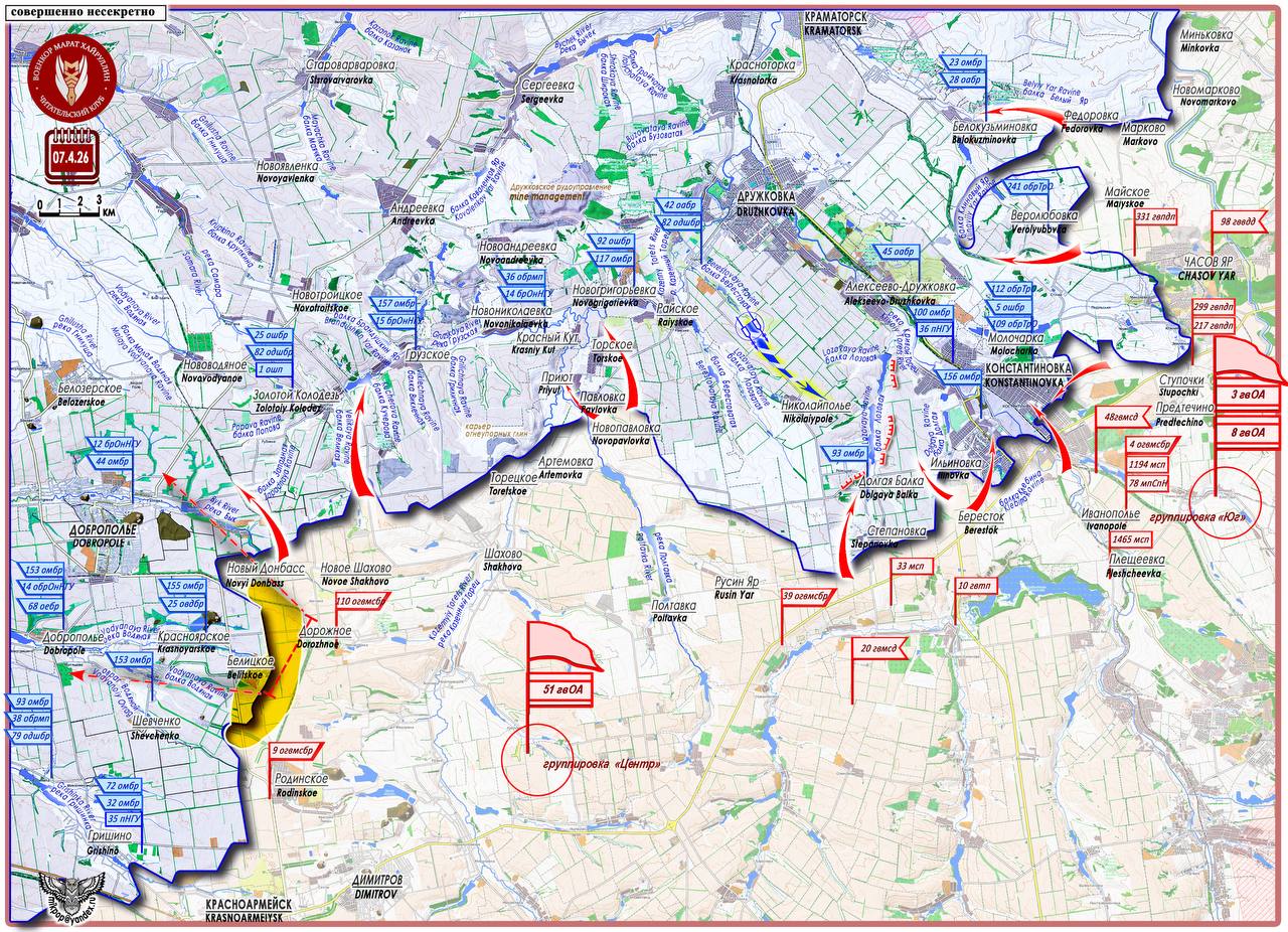 7 апреля были нанесены авиационные удары управляемыми ФАБами крупного калибра по пунктам управления, в частности по ПУ 156 мехбригады, и по позициям ВСУ в городе Константиновка. Напряженные бои идут на линии Степановка - Красный Городок.